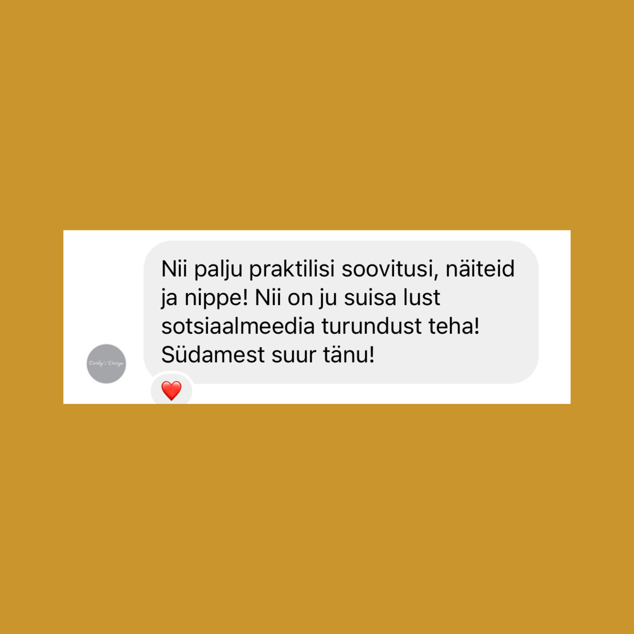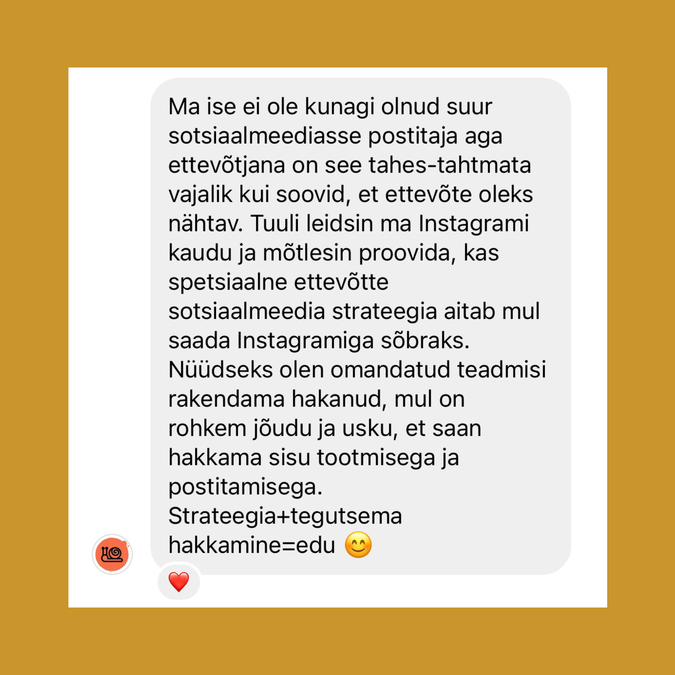“Ma ise ei ole kunagi olnud suur sotsiaalmeediasse postitaja aga ettevõtjana on see tahes-tahtmata vajalik kui soovid, et ettevõte oleks nähtav. Tuuli leidsin ma Instagrami kaudu ja mõtlesin proovida, kas spetsiaalne ettevõtte sotsiaalmeedia strateegia aitab mul saada Instagramiga sõbraks. Nüüdseks olen ma omandatud teadmisi rakendama hakanud, mul on rohkem jõudu ja usku, et saan hakkama sisu tootmisega ja postitamisega. Strateegia+tegutsema hakkamine=edu.”