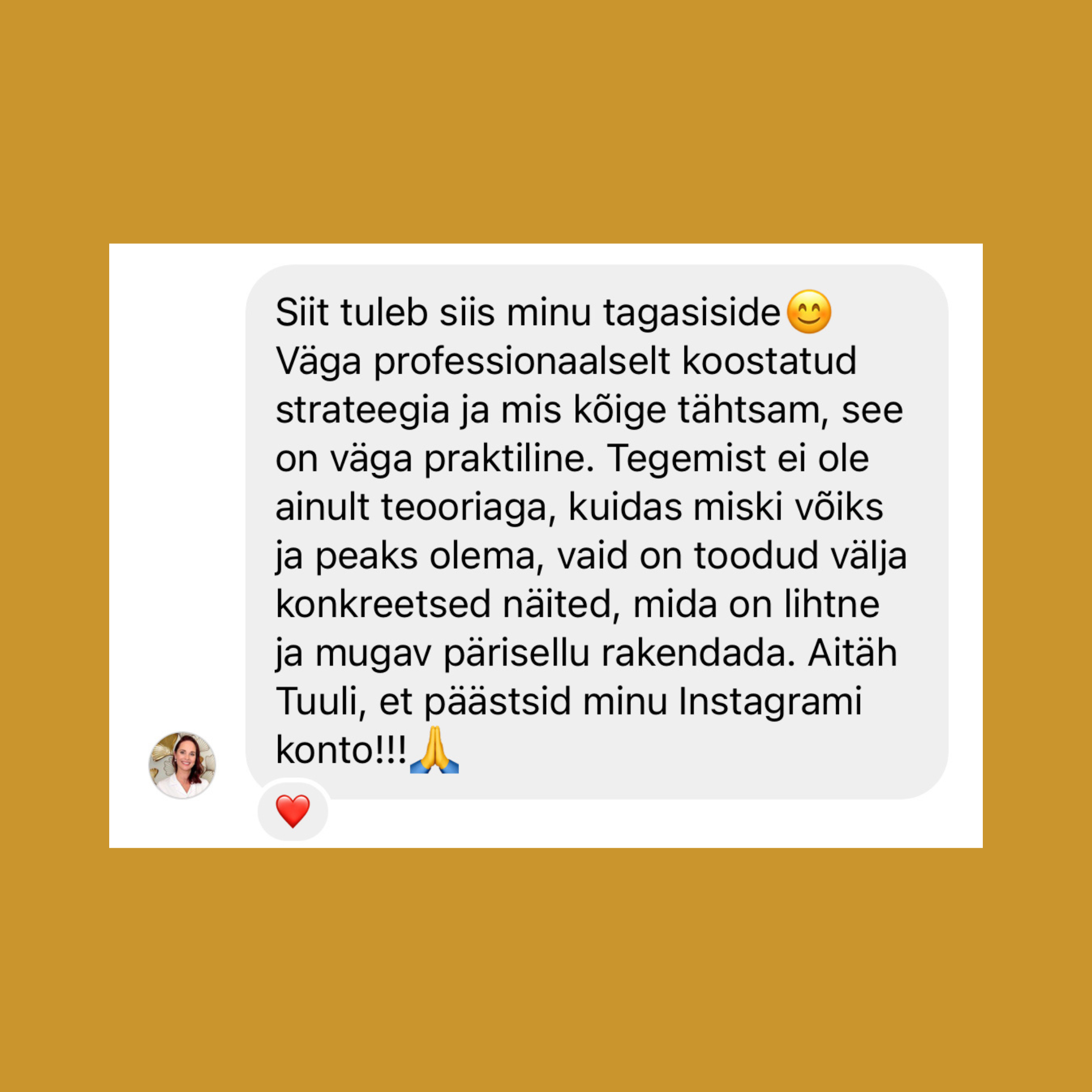 “Tuuli avastasin ma Instagramist ja on see vast hea leid 🙂 Mulle hakkas tema konto puhul kohe silma visualne keel, mis on kuidas puhas ja silmale mõnus ja muidugi sisutekstid, mis on väga osavalt koostatud. Alles hiljuti palusin Tuulil ennast aidata sisu loomisel, sest olen välja andmas oma esimest Instagrami kursust ja selle loomisel oli nii palju tööd, et vajasin veidi kõrvalist abi. Ma jäin Tuuli tekstidega väga rahule. Töö kiire ja korralik. Meie koostöö sujus ja kindlasti soovin temaga koostööd teha ka tulevikus.”